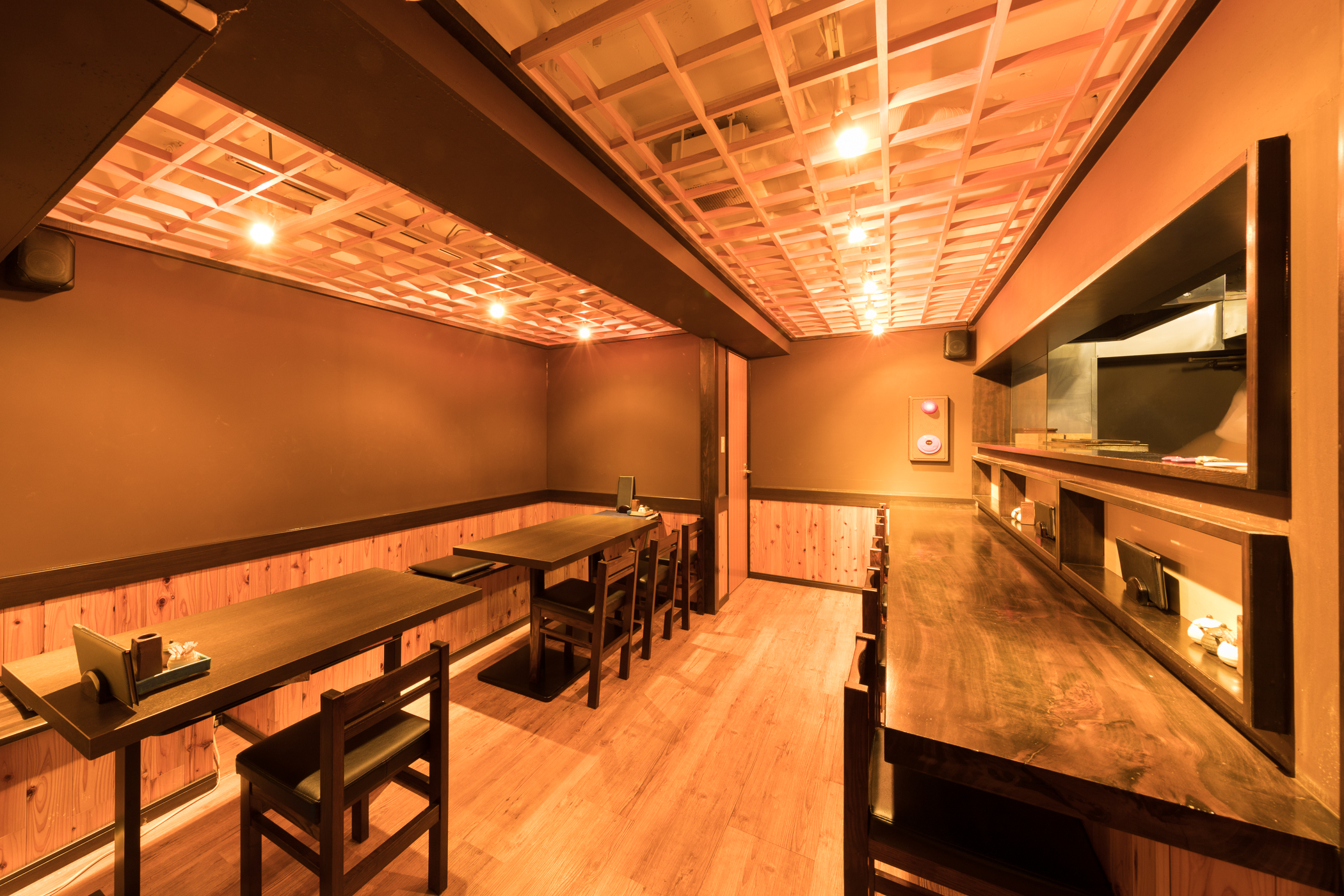 店に入ると白木と焦げ茶の落ち着いた空間が広がっている。天井の格子が何ともいい雰囲気だ。右手にカウンター、左手は奥がベンチシートになった2つのテーブル席で、一人でもグループでも楽しめる。