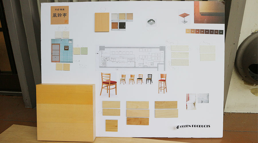 また、平面図ではわからない什器のデザイン、壁や床の質感などは、イメージが沸きやすいように実物を見せてくれたり、このようなボードを用意して説明してくれるので安心です。
