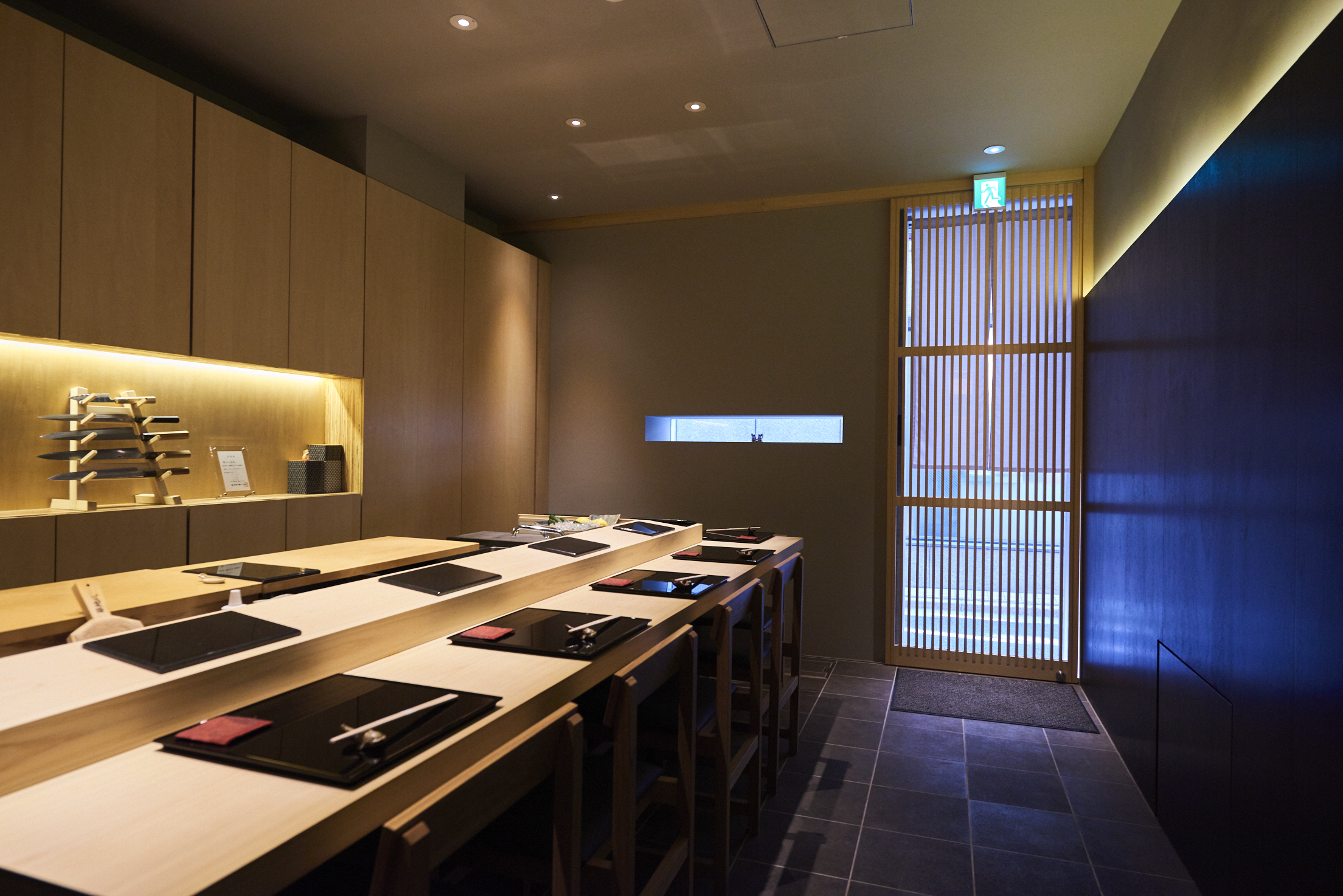 中華店から鮨店ということもあり、店構えから完全リニューアル。印象的な横長のスリット窓は外から店内は見えるが、お客さまから外は見えず、店主からは外が見えるようにと高さ、サイズの工夫がなされている。エアコンの室外機も目立たぬよう目隠しの内部に隠し、すっきりと美しい外観に。