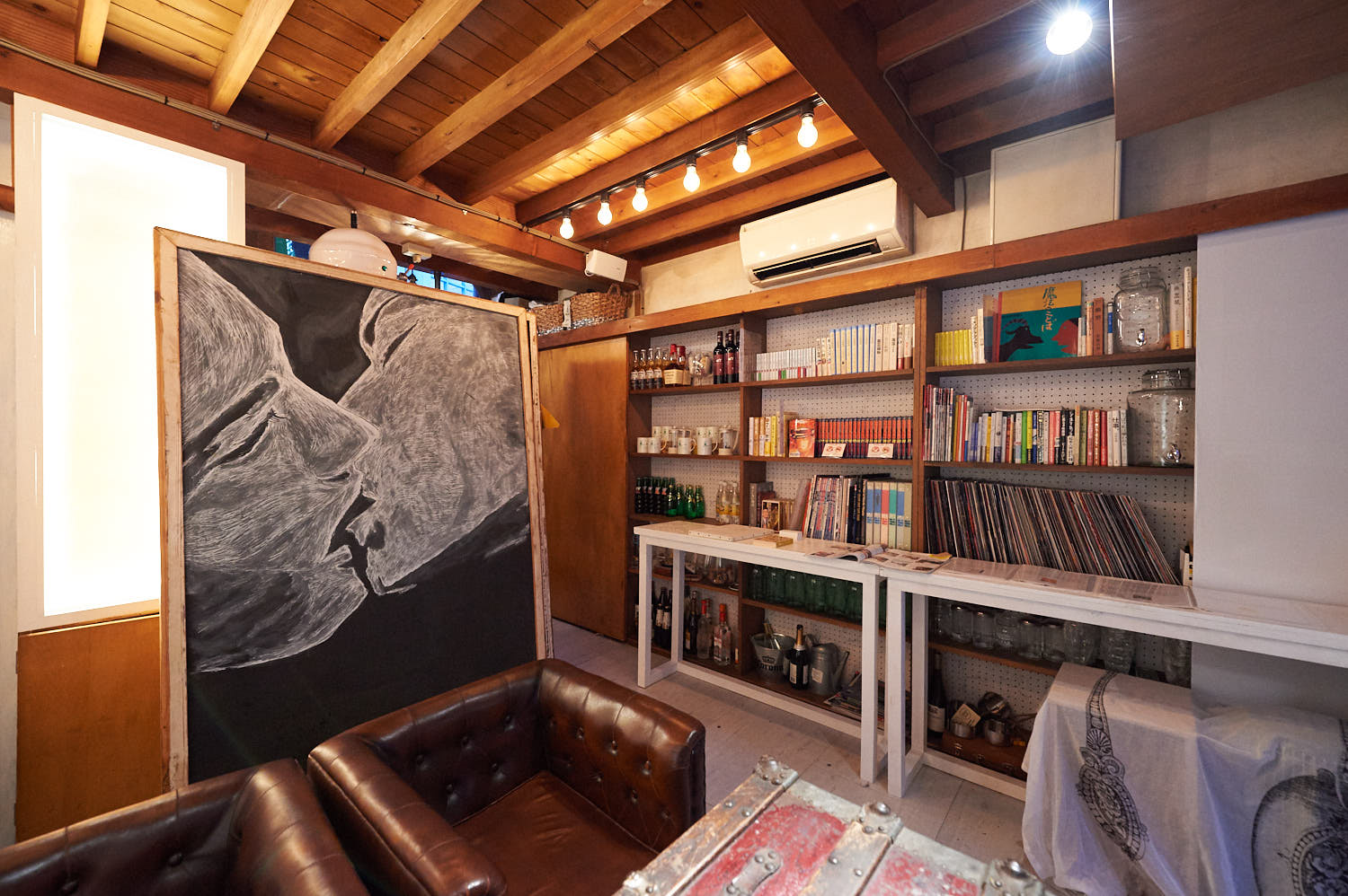 絨毯や椅子・テーブルを撤去し、居心地の良いソファを設置。お酒やグラスが並べられていた棚は本棚として活用。カウンターテーブルは手作りしてブックレビューのファイルを置いている。大きな絵が印象的。