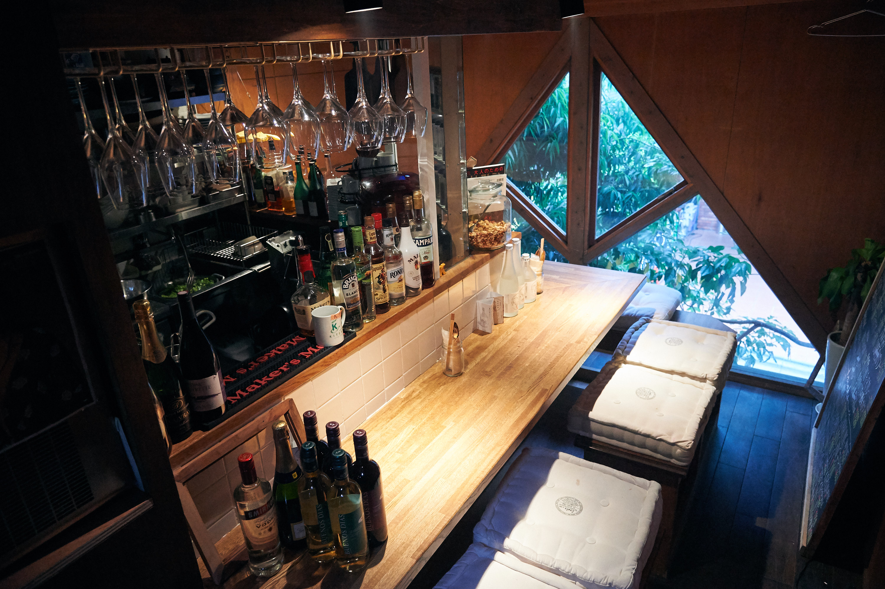 全体的に明るい印象になるよう、カウンターの壁面には白いタイルを貼り、黒の窓枠も白に塗り替えた。