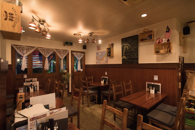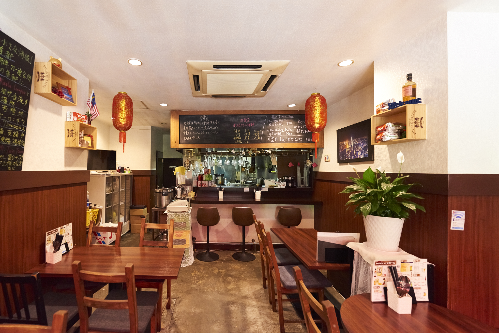 テーブル、椅子、黒板など前店舗のものをそのまま採用。シンプルな家具なので店が変わっても違和感を感じさせない。マレーシアの絵葉書や民芸品、提灯などを配置。どれも現地を知る人にとってはとても親しみのあるアイテム。今後、現地調味料の物販も充実させる予定だとか。