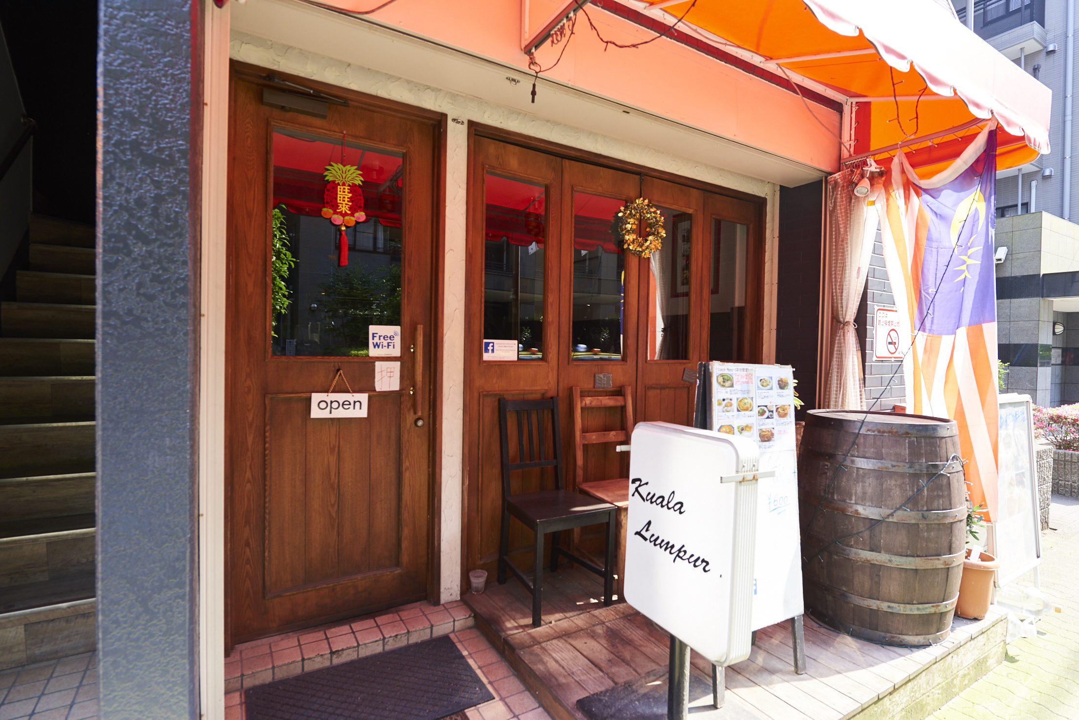 店頭は樽などの装飾品もそのまま活用。国旗を掲げることでマレーシア料理店をしっかりアピール。