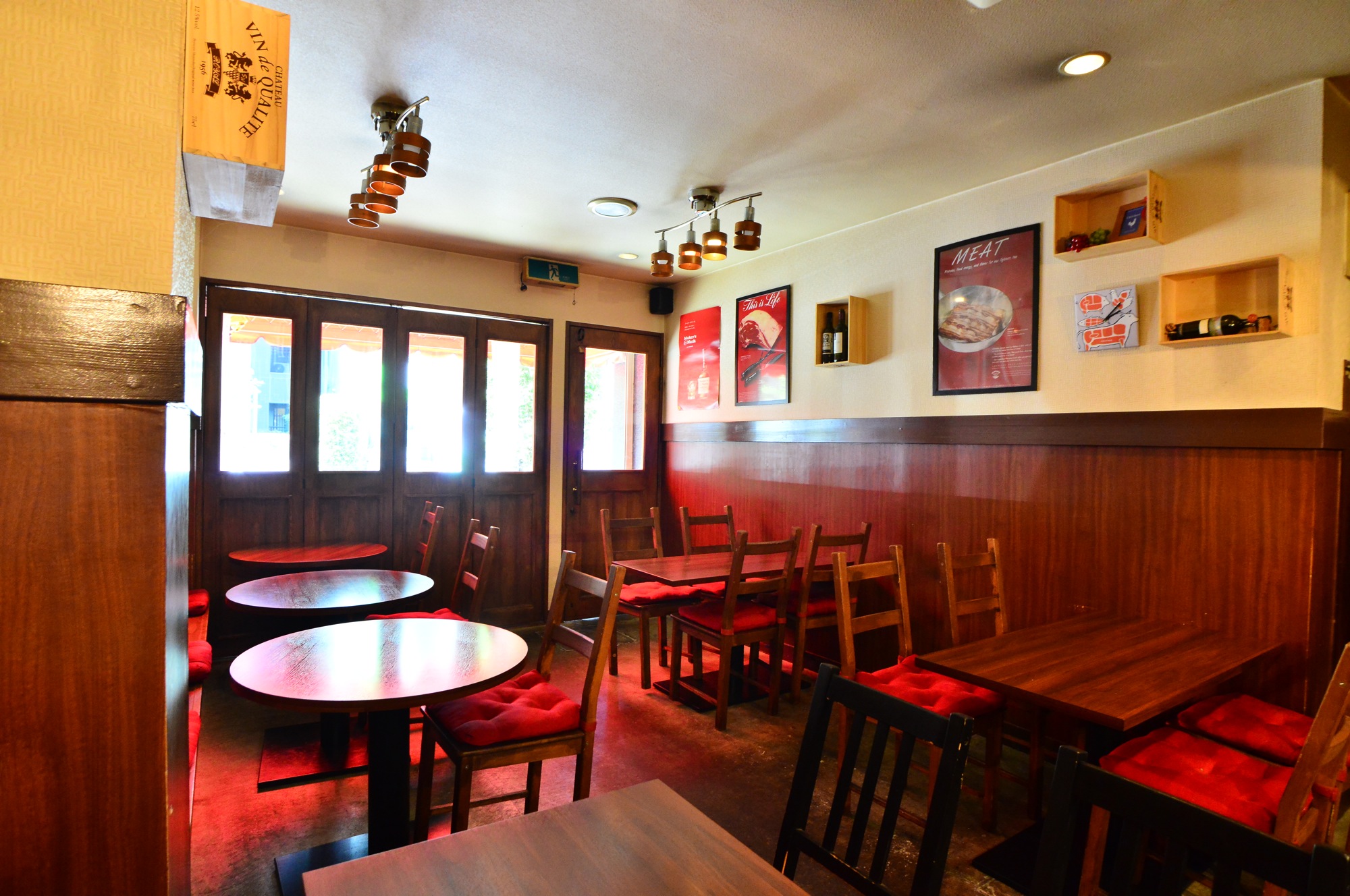 レースのカーテンをあしらうだけでもレストランらしい上品さが生まれる。ちょっとした工夫が大きな効果をもたらす好例。