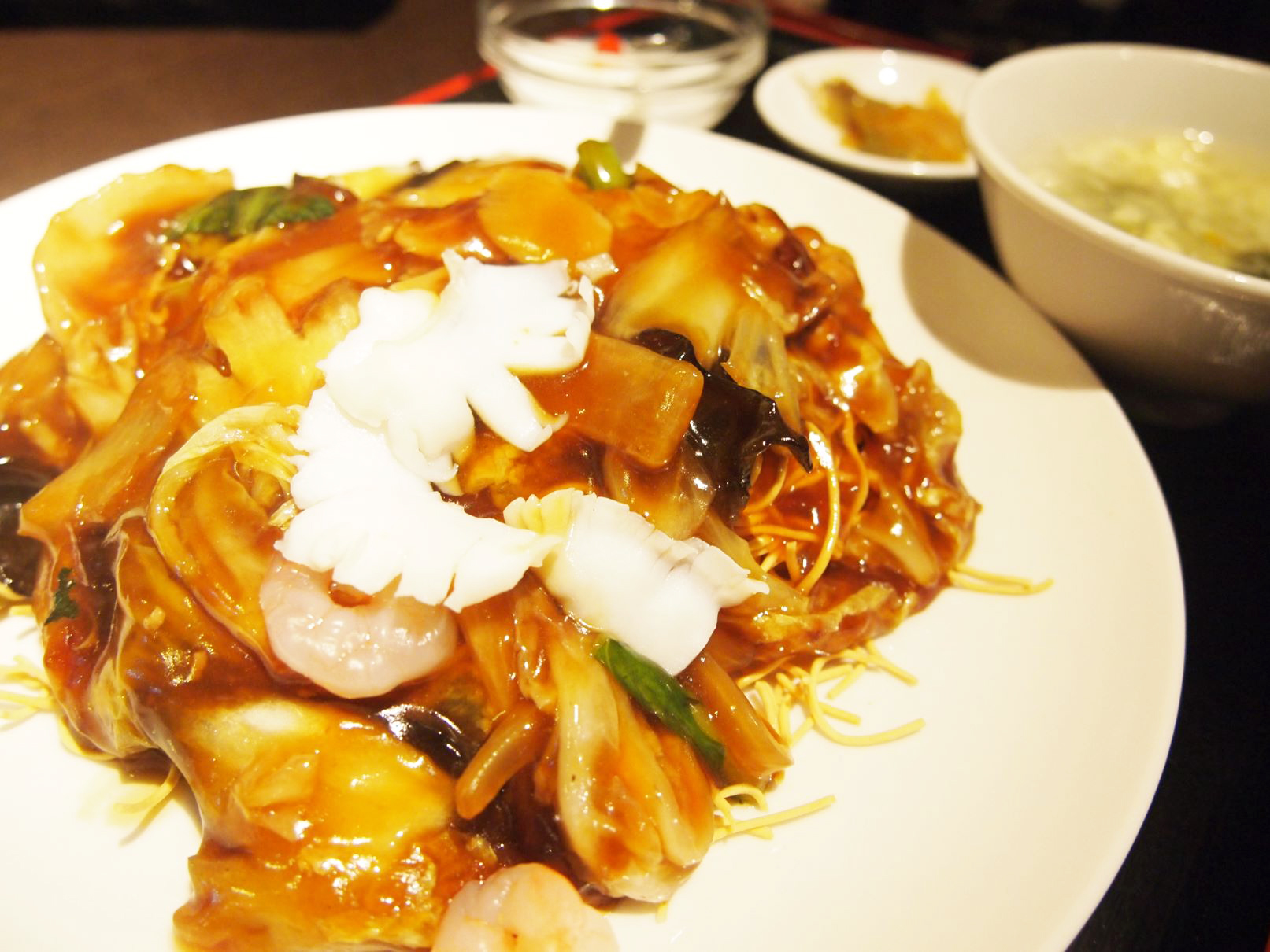 具沢山の五目かた焼きそばに、スープと杏仁豆腐、お漬物もセットです。