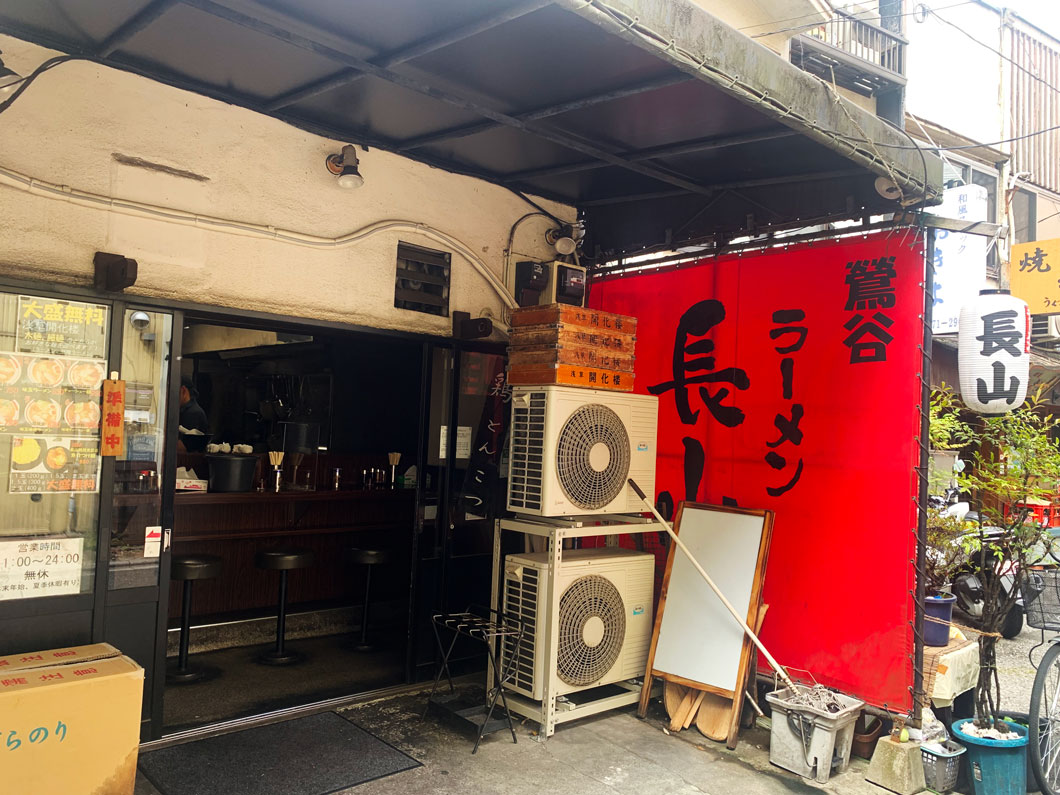 新坂を下って左手側、居酒屋が立ち並ぶ中にある人気のラーメン店「ラーメン長山」。