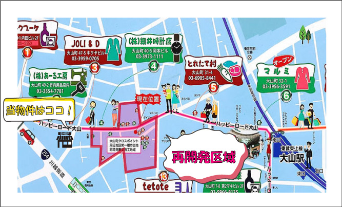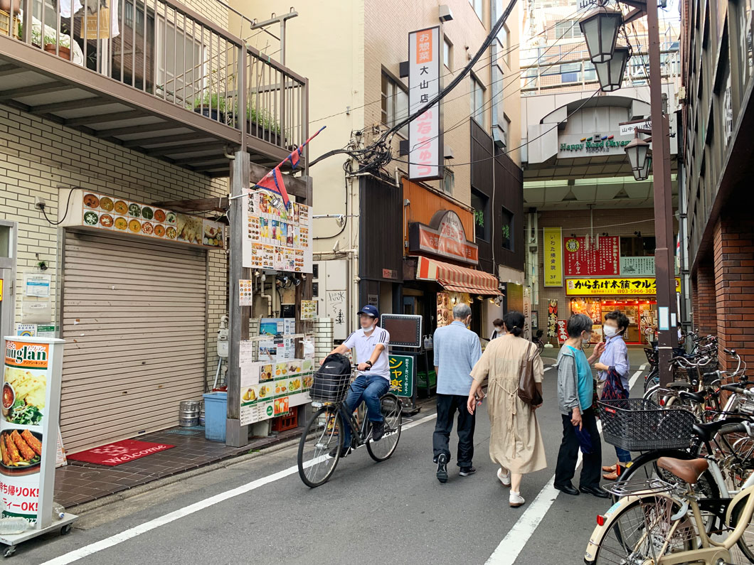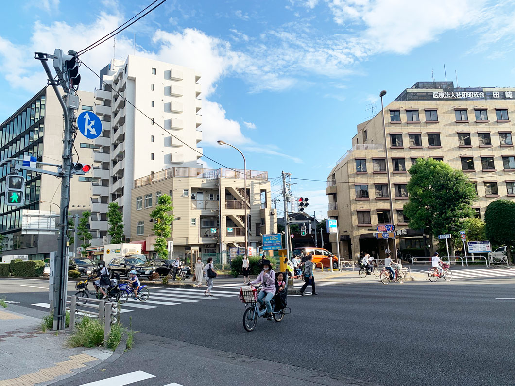 当物件は、「ハッピーロード商店街」から1本路地に入った場所に位置していますが、その路地を抜けた先には交通量の多い「川越街道」と「都道420号鮫洲大山線」が交わる交差点。大山は、地域柄自転車の利用者が多い為、車だけでなく自転車利用者の往来が絶えないのが特徴的です。