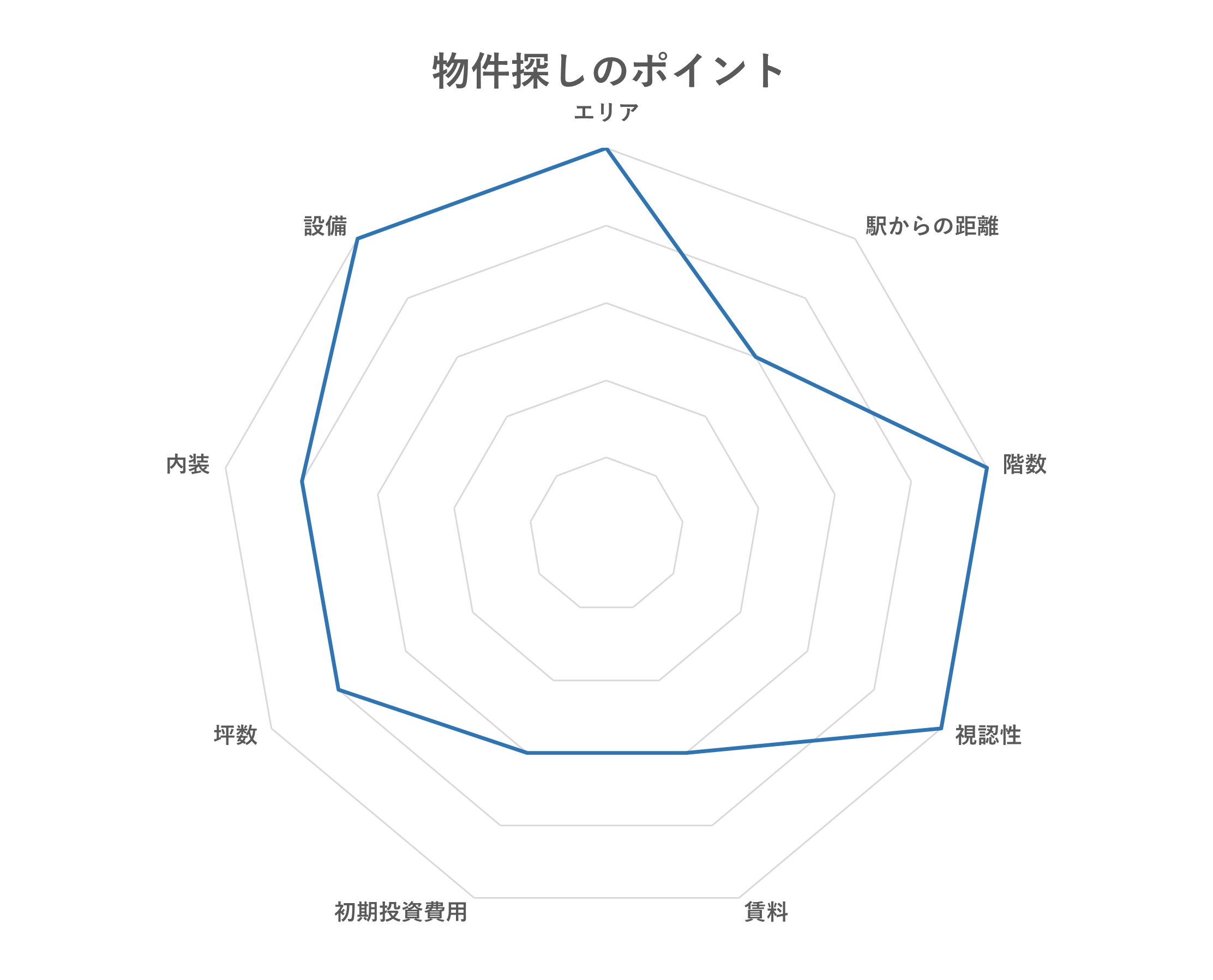 なお、エリア以外の条件については特段こだわりなく、“駅チカ”や“商店街沿い”などの立地面も限定せず。居抜き物件から優先的に検討しつつ、スケルトンも視野に入れて出店先を探していました。