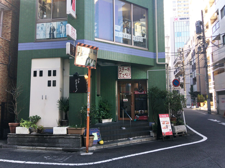 オフィス街、繁華街として知られる五反田。西口を出て、目黒川を越えたあたりまで来ると、駅前の喧騒は少し落ち着いてくる。オフィスビルが建ち並ぶ「桜田通り」から西に2 本はいった裏通り、中小のオフィスや古くからの住宅に周りを囲まれた穏やかなエリアに、薄緑色の建物がある。その一階に、2016 年11 月から店を構えているのが、六本木、新宿、池袋、新橋に店舗をもつ、「ステーキてっぺい」の五反田店だ。